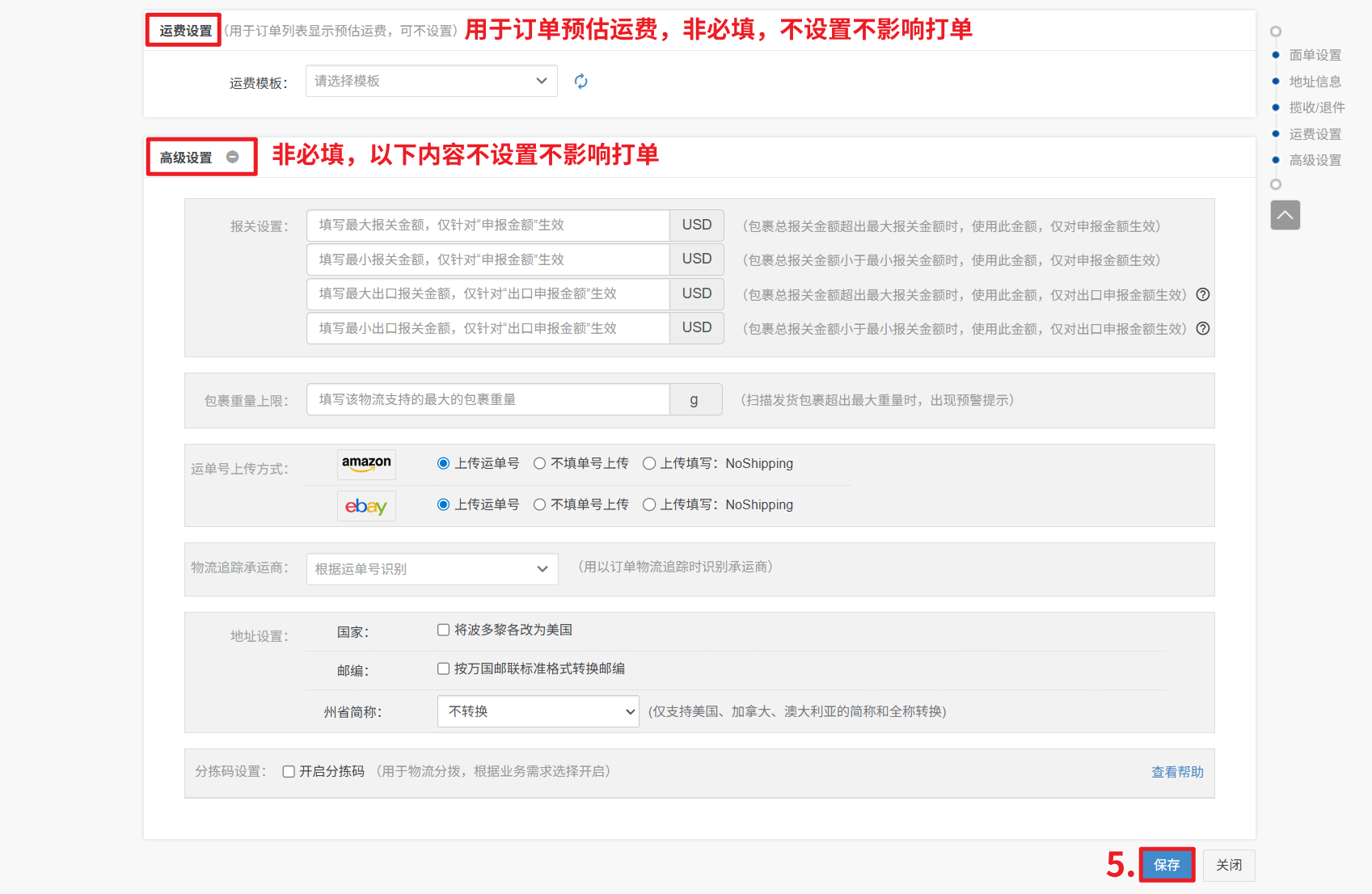 2、填写最大或最小报关金额/出口报关金额后,当您订单报关金额,超过这个最大报关金额后,以填写的最大报关金额向物流商提交