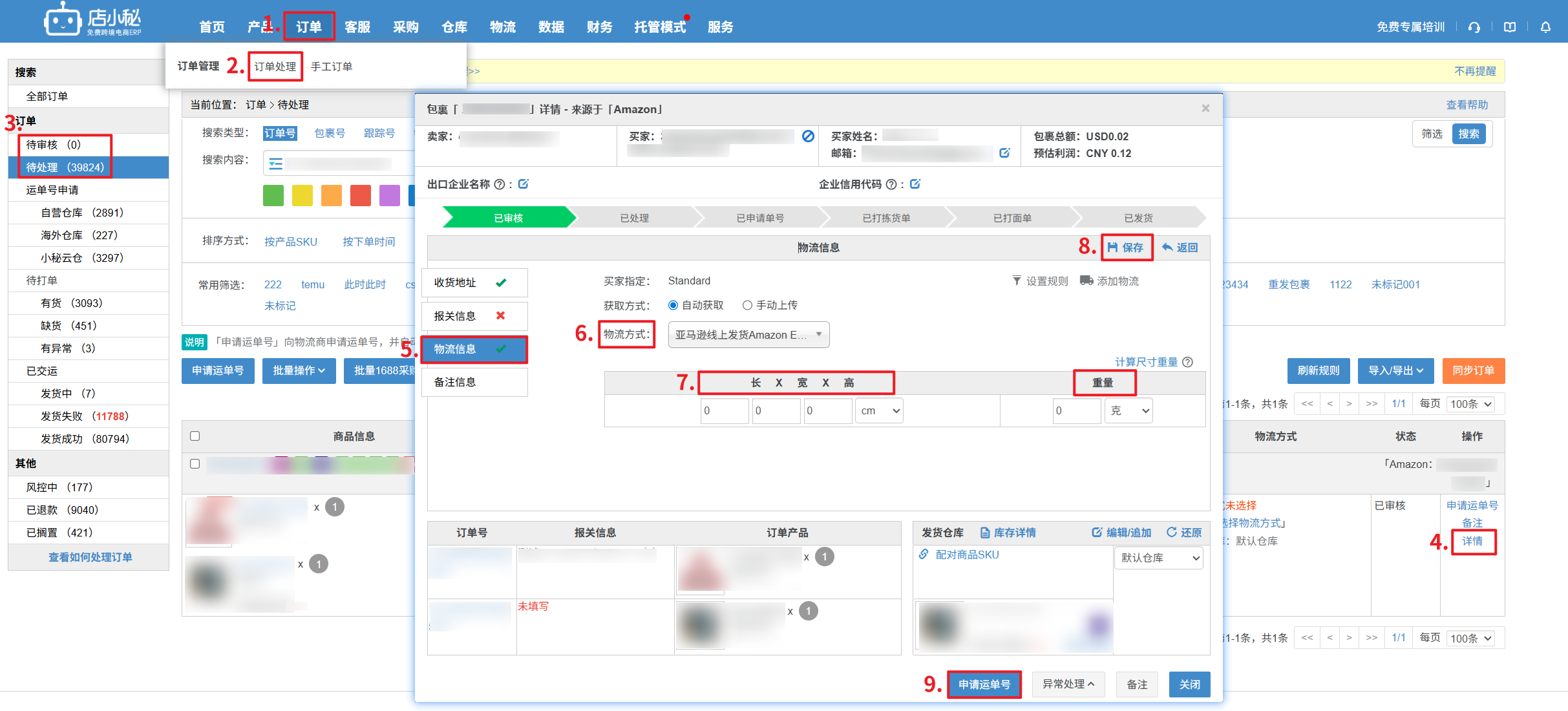 —填写尺寸/重量—保存并申请单号即可】