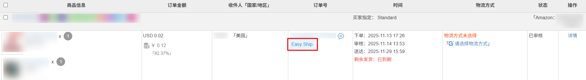 【5】亚马逊订单同步到小秘带有“Easy Ship”标识,必须选择亚马逊线上发货Amazon Easy Ship物流发货