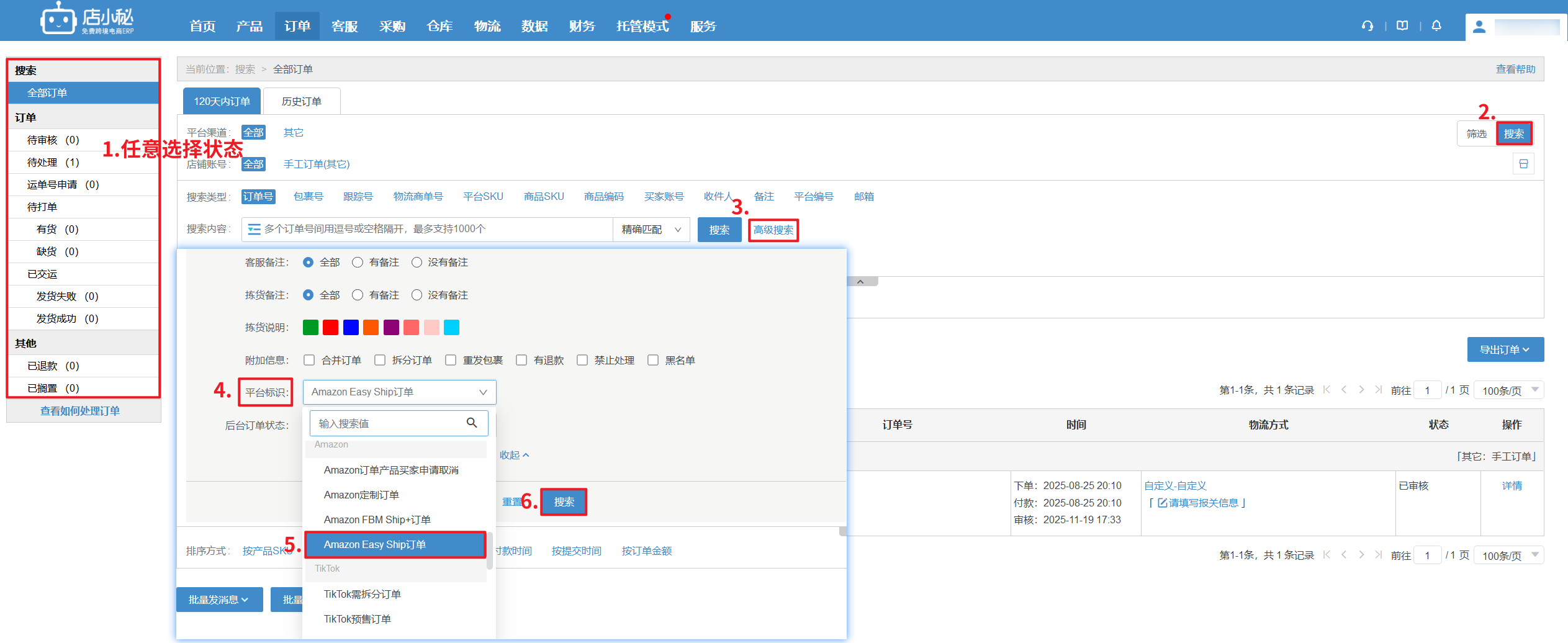 【订单任意状态—搜索—高级搜索—平台标识—下拉选择“Amazon Easy Ship订单”—确定】