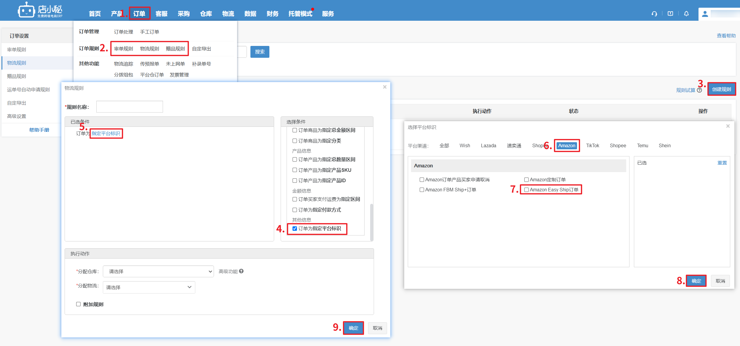 【订单—审单/物流/赠品规则—创建规则—勾选指定平台标识—点击蓝色字体—选择Amazon平台—勾选“Amazon Easy Ship订单”—确定】