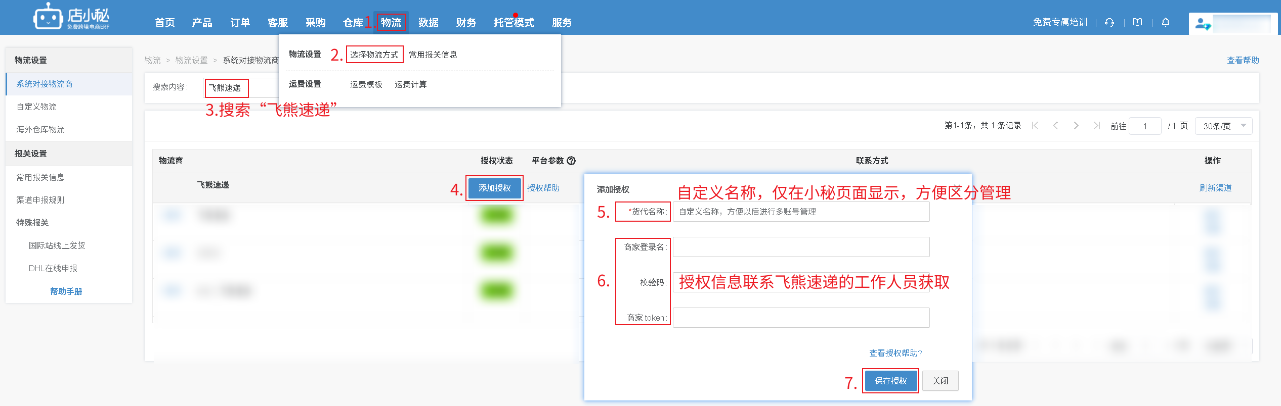 第一步:【物流—选择物流方式—搜索“飞熊速递”—添加授权—自定义物流商名称—授权信息联系飞熊速递的工作人员获取—保存授权】