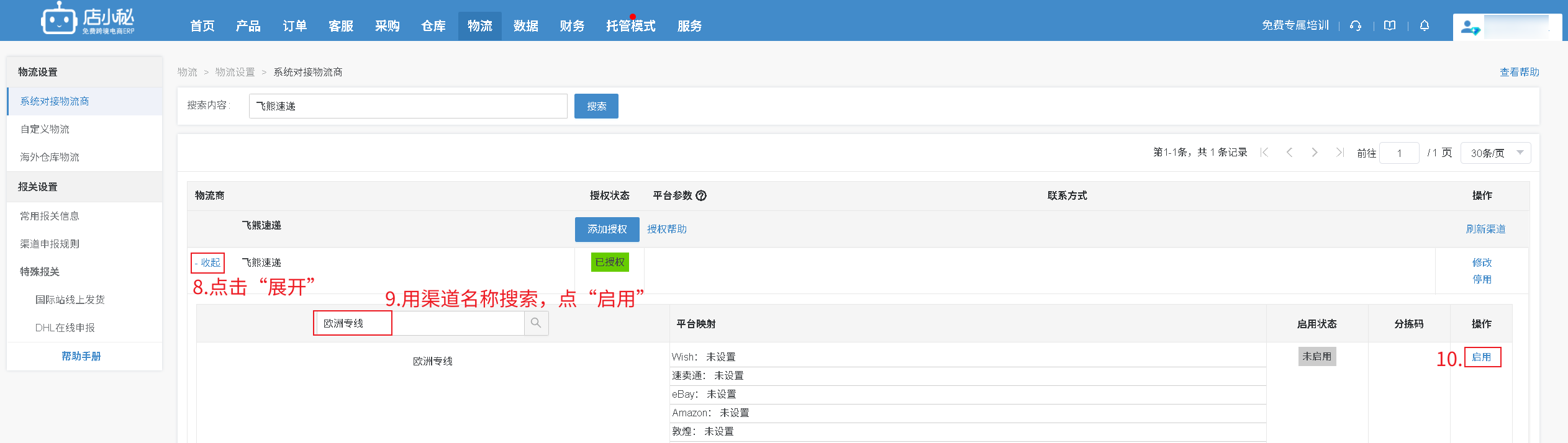 第一步完成授权后,仅代表店小秘和物流的授权打通了,接下来要告诉物流商你的订单走哪个渠道,物流商下面有很多渠道,