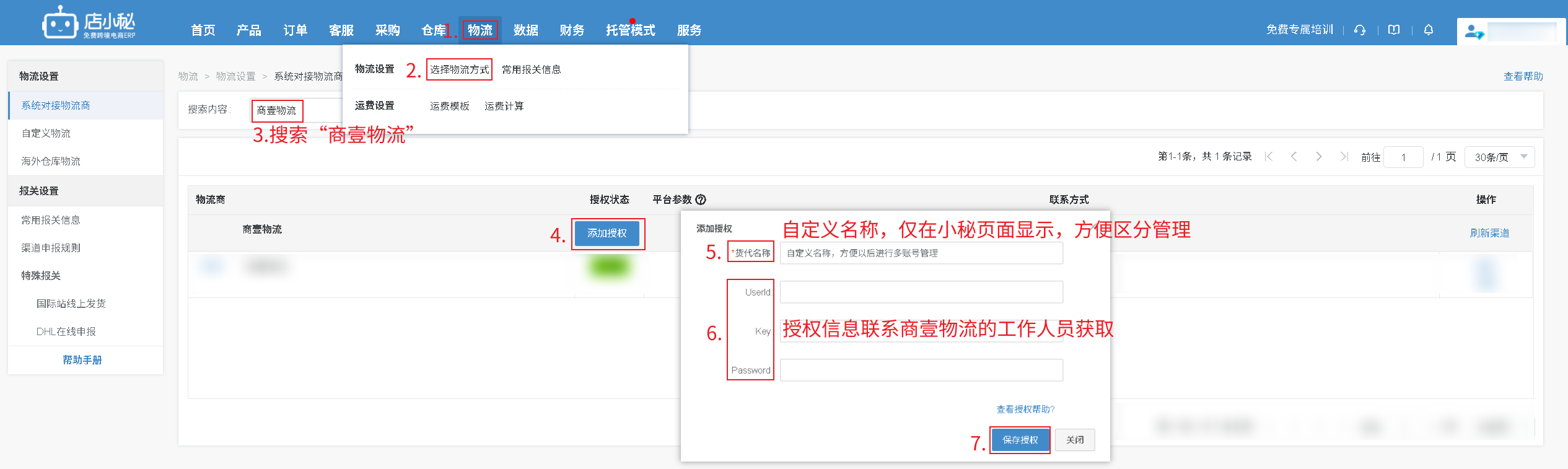 第一步:【物流—选择物流方式—搜索“商壹物流”—添加授权—自定义物流商名称—授权信息联系商壹物流的工作人员获取—保存授权】