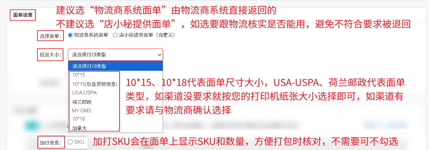 纸张大小:10*15、10*18代表面单尺寸大小,USA-USPA、荷兰邮政代表面单类型,如渠道没要求就按您的打印机纸张大小选择