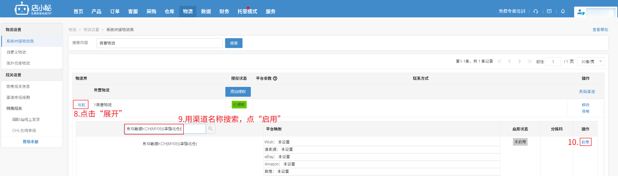 确认清楚后,在店小秘搜索这个渠道的名称,点启用,处理订单就可以选择“已启用”的渠道申请运单号。