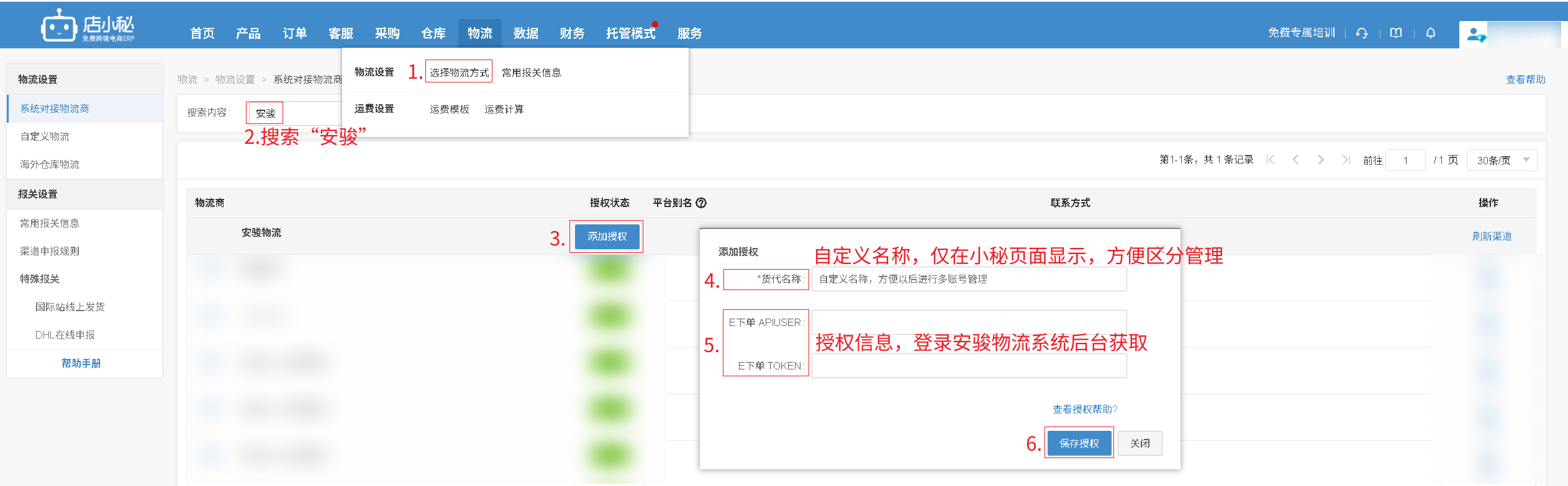 第一步:【物流—选择物流方式—搜索“安骏/安骏物流”—添加授权—自定义物流商名称—授权信息登录安骏物流系统后台获取—保存授权】
