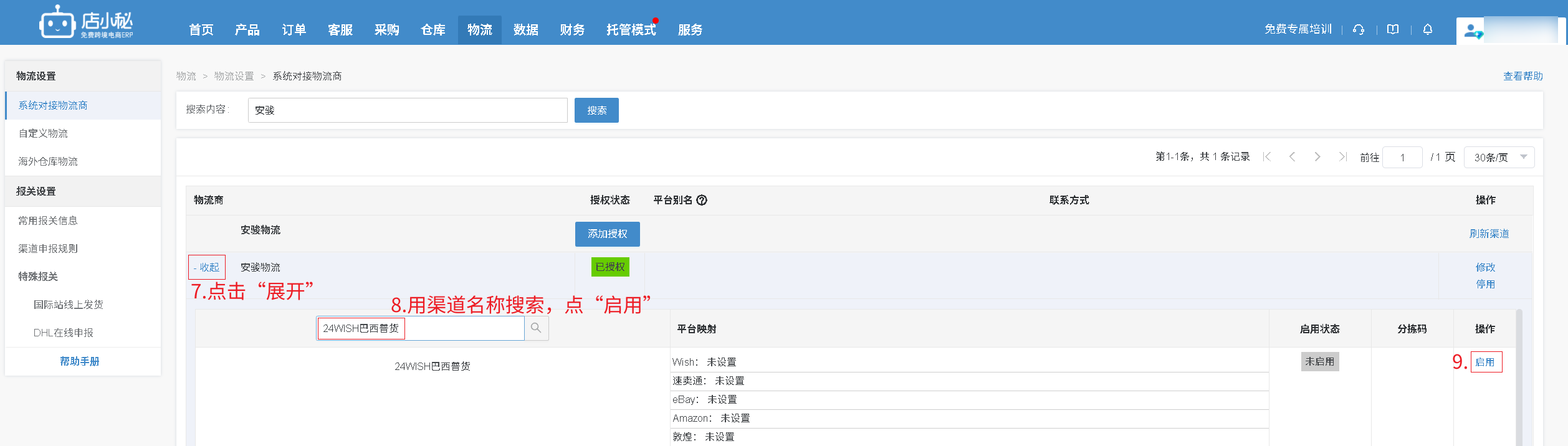 确认清楚后,在店小秘搜索这个渠道的名称,点启用,处理订单就可以选择“已启用”的渠道申请运单号。