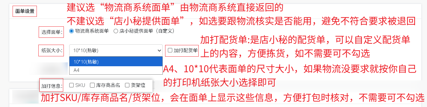选择面单:请选“物流商系统面单”,由物流商系统直接返回的,不建议选“店小秘提供面单”,如选要跟物流核实是否能用,避免