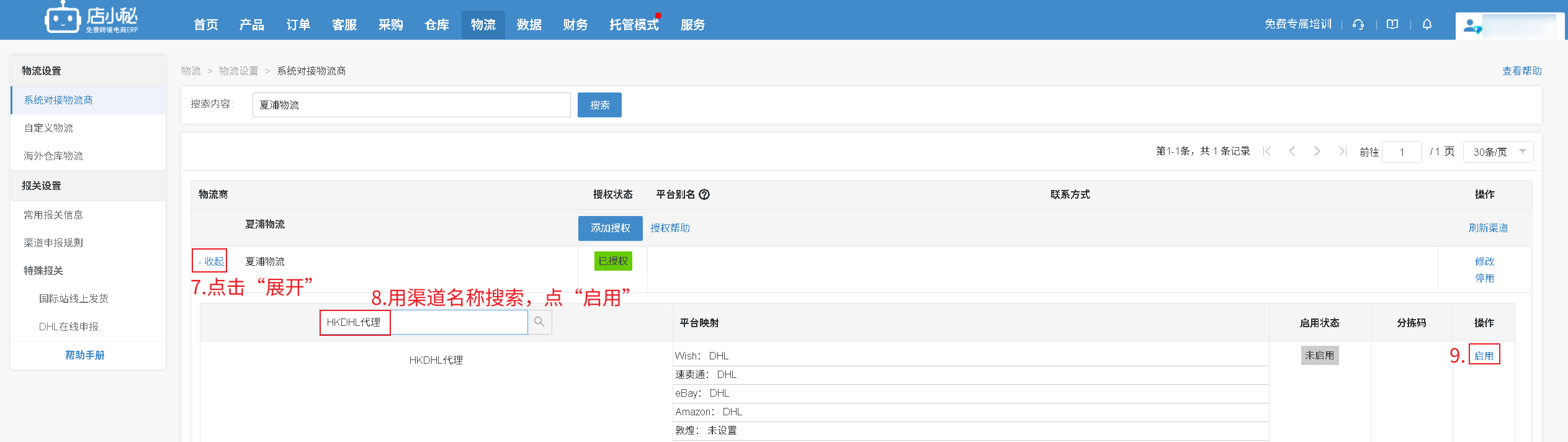 第一步完成授权后,仅代表店小秘和物流的授权打通了,接下来要告诉物流商你的订单走哪个渠道,物流商下面有很多渠道,