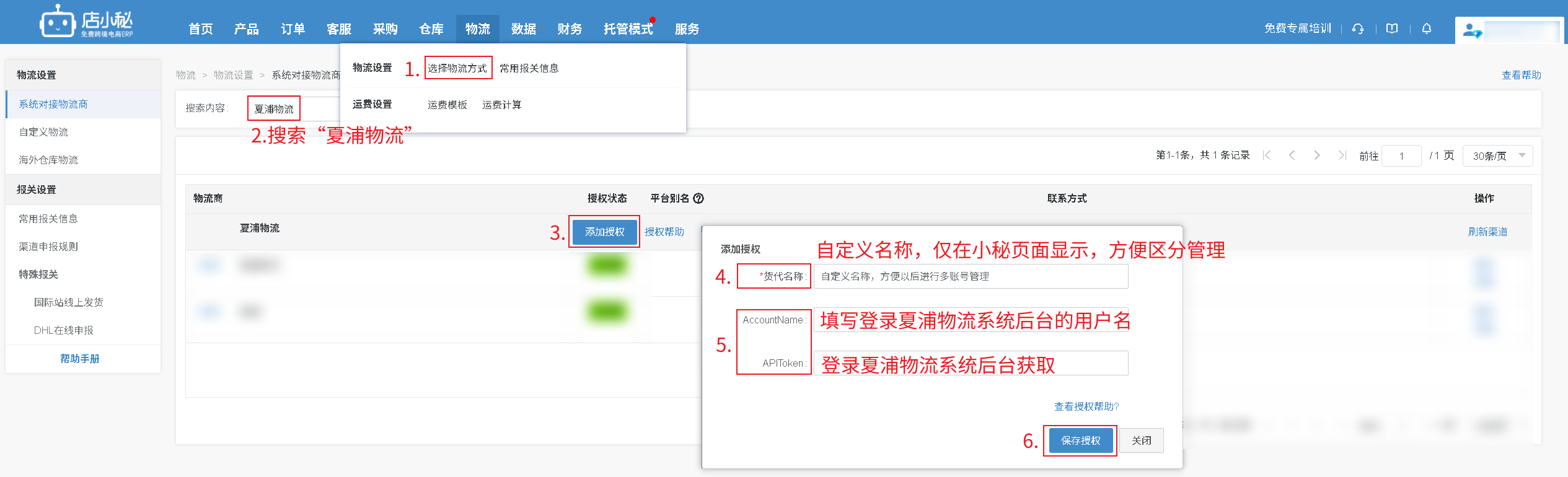 第一步:【物流—选择物流方式—搜索“夏浦物流”—添加授权—自定义物流商名称—填写授权信息—保存授权】