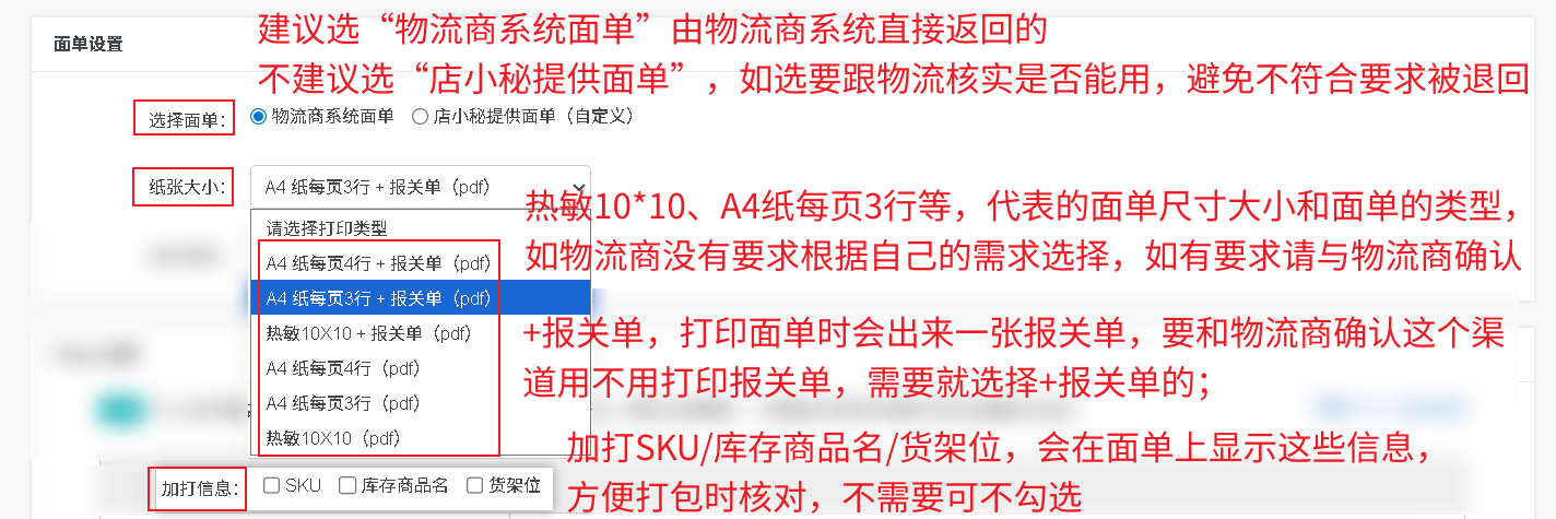 选择面单:请选“物流商系统面单”,由物流商系统直接返回的,不建议选“店小秘提供面单”,如选要跟物流核实是否能用,避免