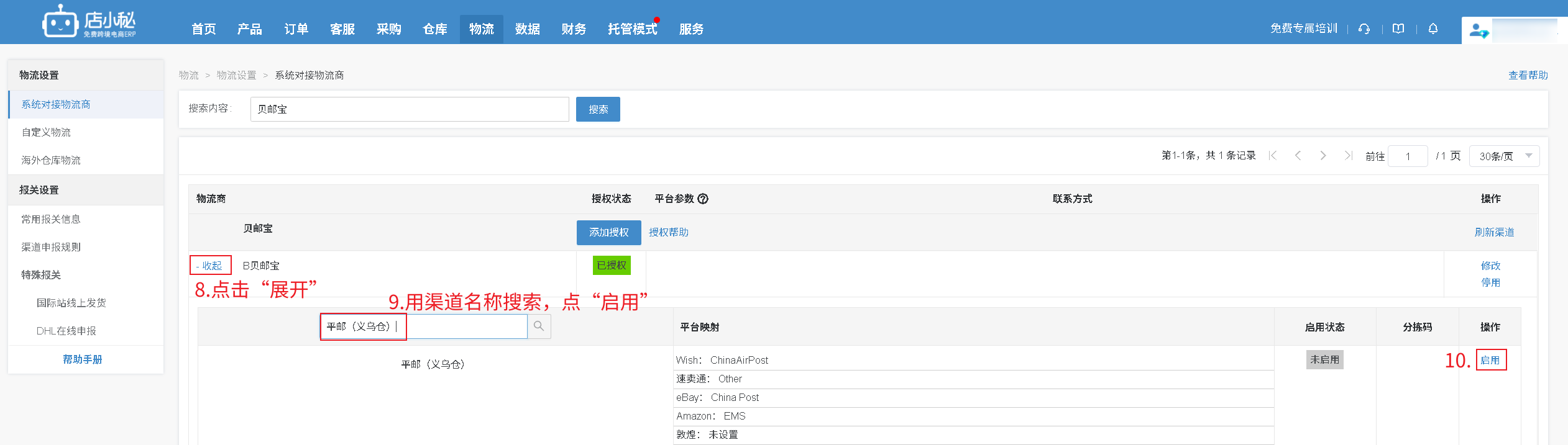 第一步完成授权后,仅代表店小秘和物流的授权打通了,接下来要告诉物流商你的订单走哪个渠道,物流商下面有很多渠道,