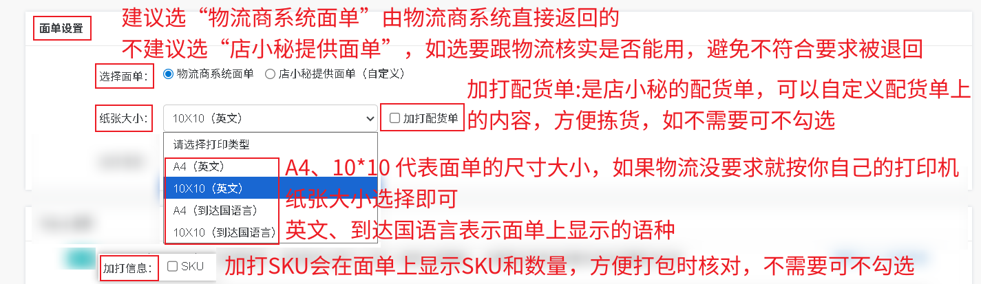 选择面单:请选“物流商系统面单”,由物流商系统直接返回的,不建议选“店小秘提供面单”,如选要跟物流核实是否能用,避免