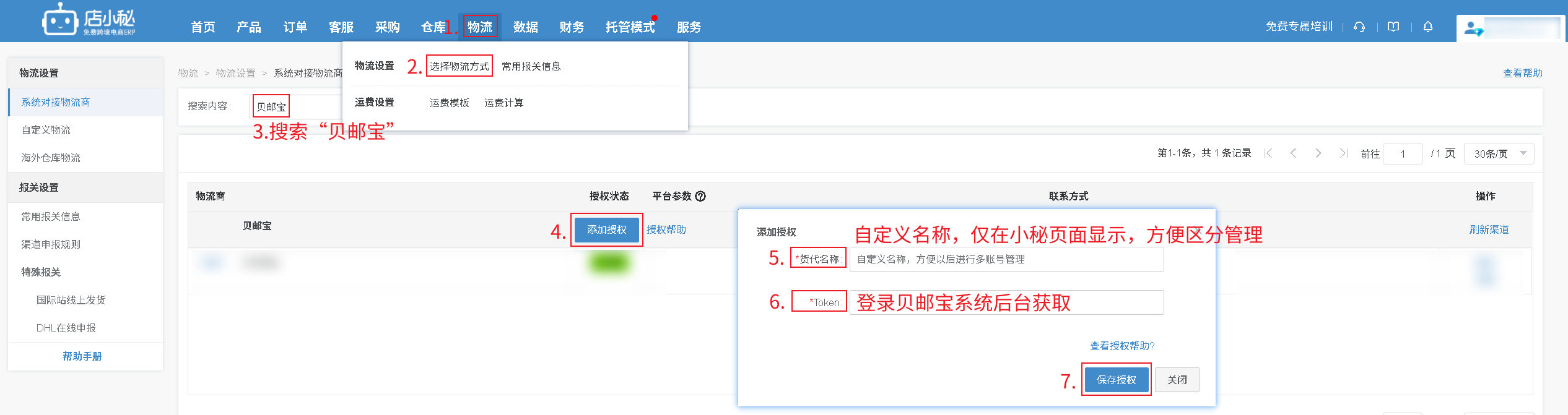 第一步:【物流—选择物流方式—搜索“百顺达”—添加授权—自定义物流商名称—授权信息联系百顺达工作人员获取—保存授权】