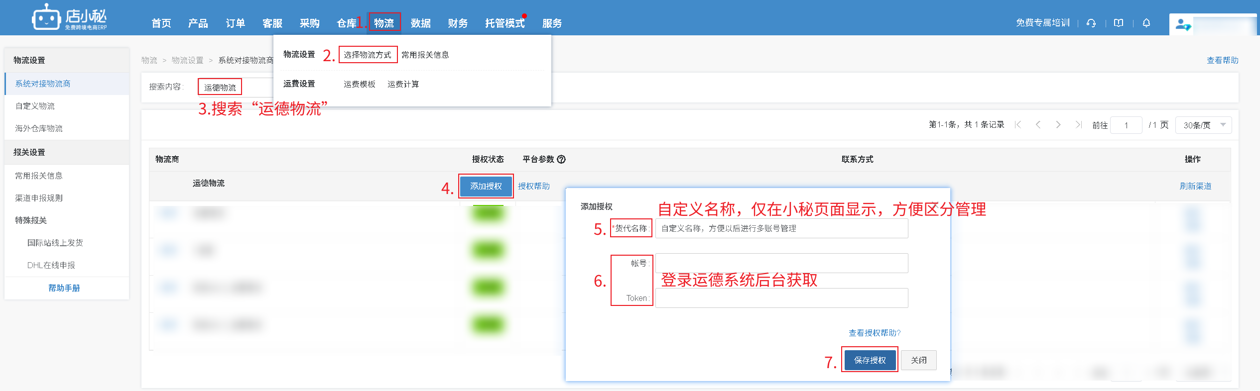 第一步:【物流—选择物流方式—搜索“运德物流”—添加授权—自定义物流商名称—授权信息登录运德物流后台获取—保存授权】