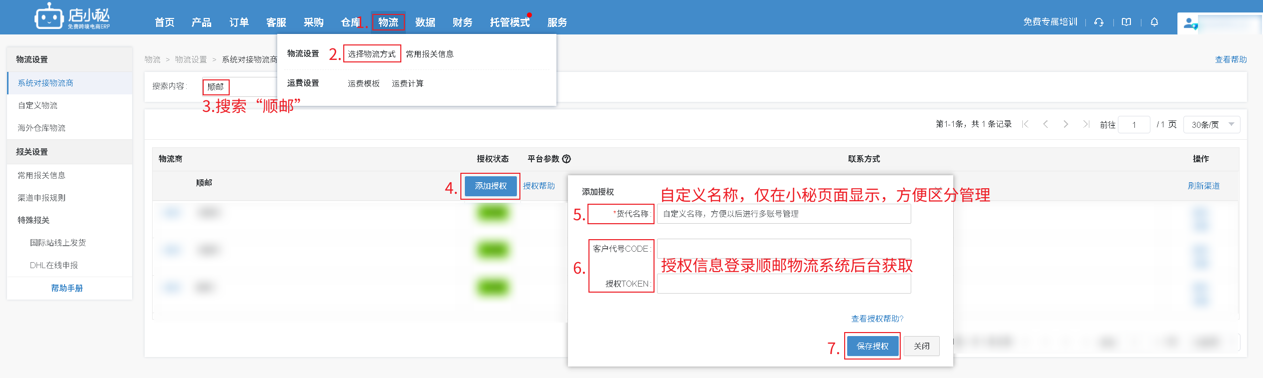 第一步:【物流—选择物流方式—搜索“顺邮”—添加授权—自定义物流商名称—授权信息登录顺邮系统获取—保存授权】
