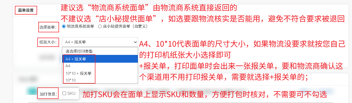 选择面单:请选“物流商系统面单”,由物流商系统直接返回的,不建议选“店小秘提供面单”,如选要跟物流核实是否能用,避免