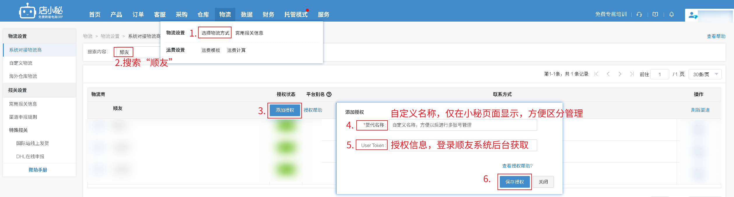 第一步:【物流—选择物流方式—搜索“顺友”—添加授权—自定义物流商名称—授权信息,登录顺友系统后台获取—保存授权】