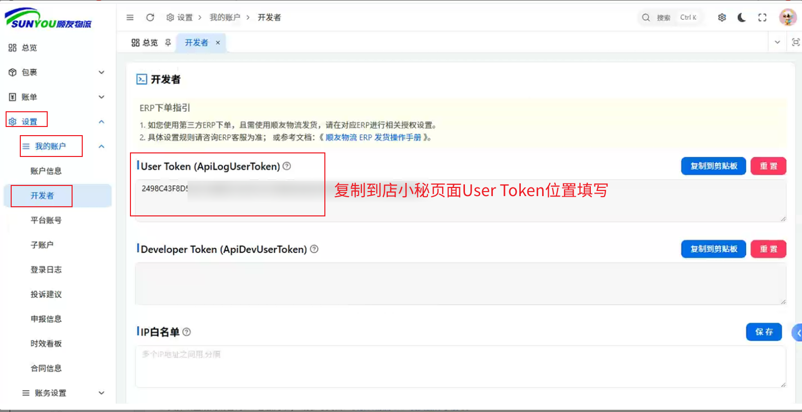 2、User Token:点击登录顺友,进入设置-我的账户下的【开发者】页面,即可查看到User Token,复制到店小秘即可。