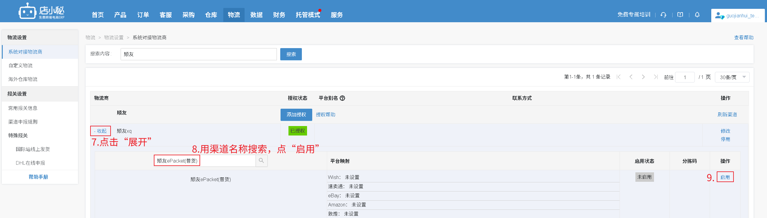 第一步完成授权后,仅代表店小秘和物流的授权打通了,接下来要告诉物流商你的订单走哪个渠道,物流商下面有很多渠道,