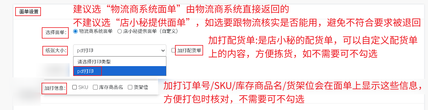 选择面单:请选“物流商系统面单”,由物流商系统直接返回的,不建议选“店小秘提供面单”,如选要跟物流核实是否能用,避免