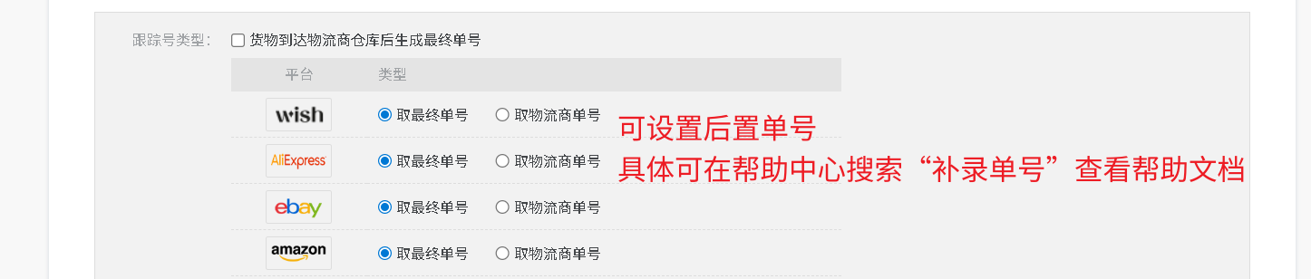 【补录单号】:部分物流渠道,需要生成一个中转单号和面单将货物寄到物流商仓库,才会生成最终的物流单号;