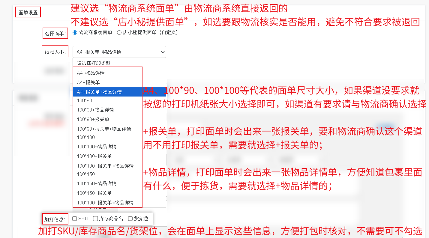 选择面单:请选“物流商系统面单”,由物流商系统直接返回的,不建议选“店小秘提供面单”,如选要跟物流核实是否能用,避免