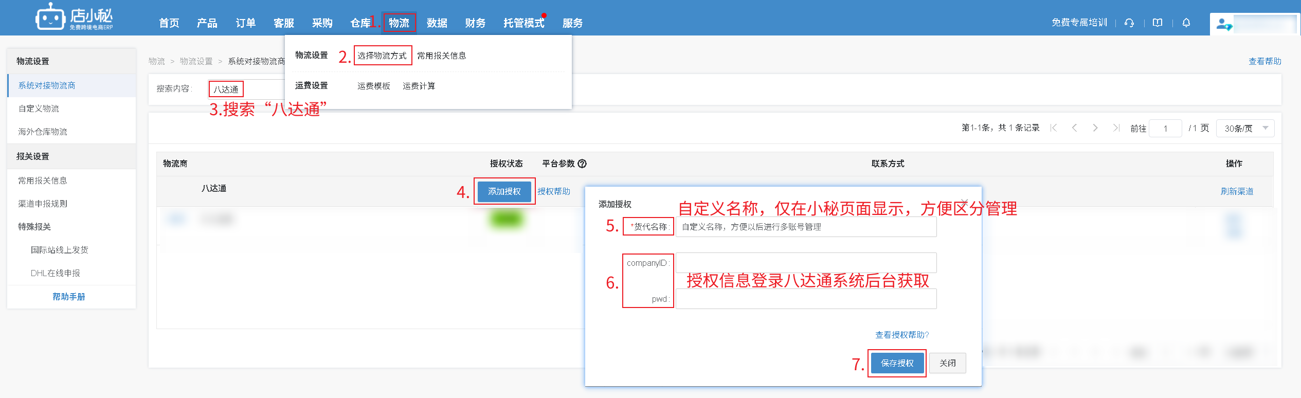 第一步:【物流—选择物流方式—搜索“八达通”—添加授权—自定义物流商名称—授权信息登录八达通系统后台获取—保存授权】