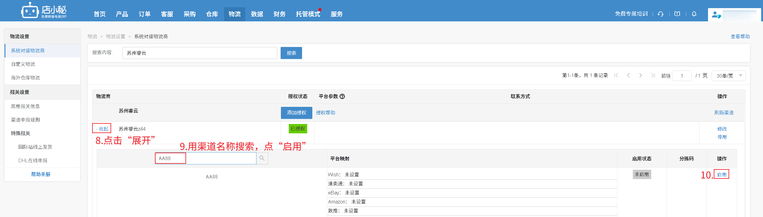 确认清楚后,在店小秘搜索这个渠道的名称,点启用,处理订单就可以选择“已启用”的渠道申请运单号。