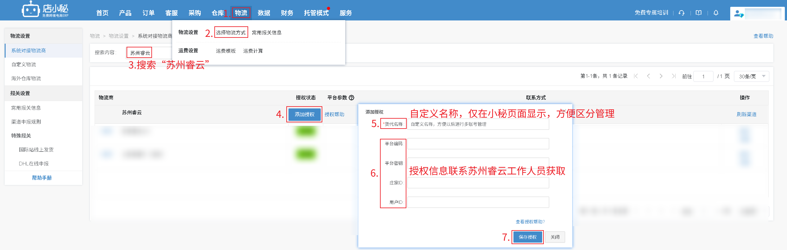 第一步:【物流—选择物流方式—搜索“苏州睿云”—添加授权—自定义物流商名称—授权信息联系苏州睿云工作人员获取—保存授权】