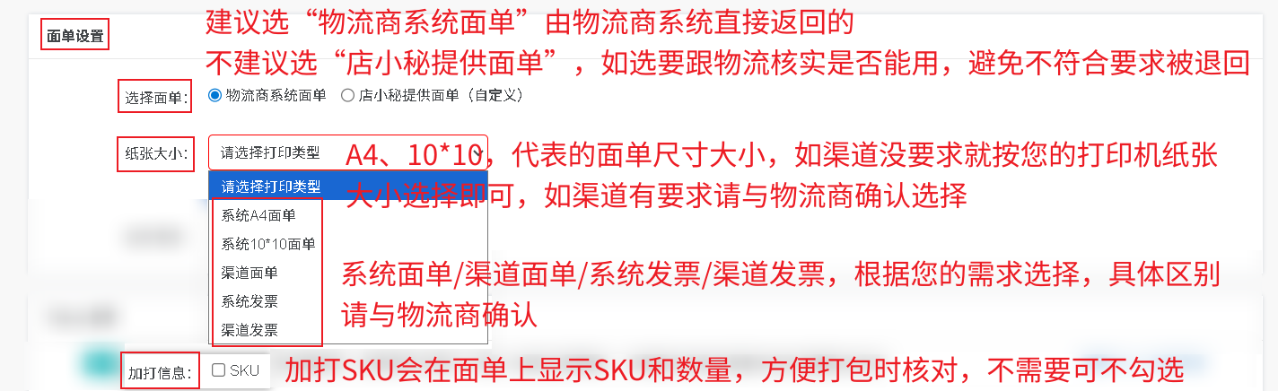 选择面单:请选“物流商系统面单”,由物流商系统直接返回的,不建议选“店小秘提供面单”,如选要跟物流核实是否能用,避免