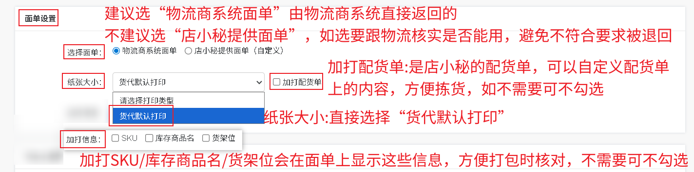 选择面单:请选“物流商系统面单”,由物流商系统直接返回的,不建议选“店小秘提供面单”,如选要跟物流核实是否能用,避免