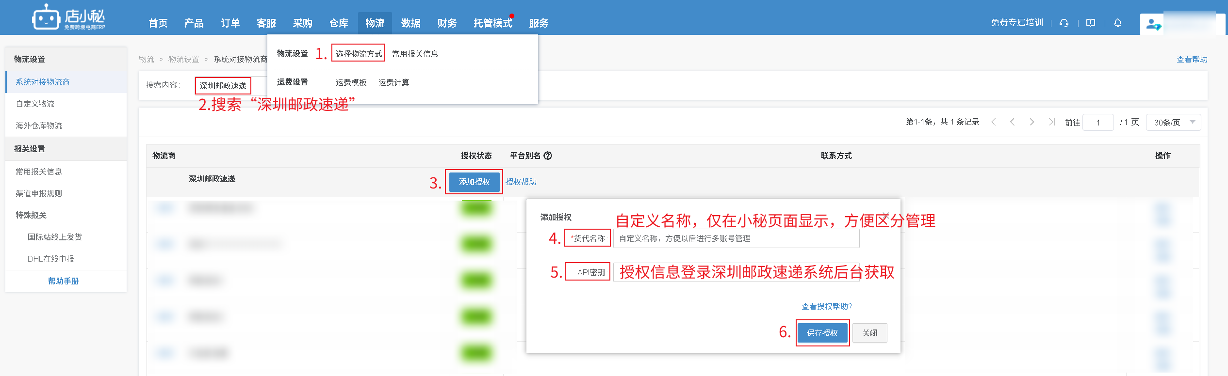 第一步:【物流—选择物流方式—搜索“深圳邮政速递”—添加授权—自定义物流商名称—授权信息登录深圳邮政速递后台获取—保存授权】