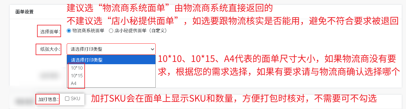 选择面单:请选“物流商系统面单”,由物流商系统直接返回的,不建议选“店小秘提供面单”,如选要跟物流核实是否能用,避免