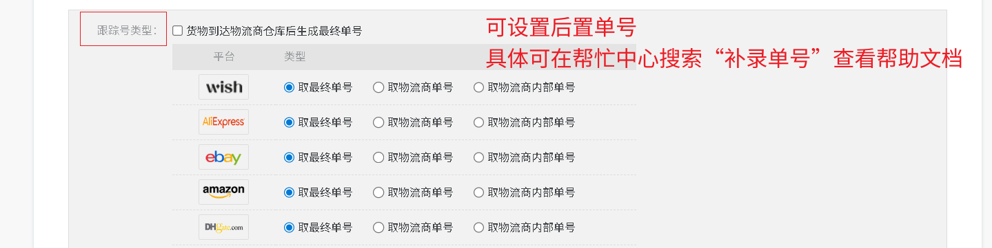 【补录单号】:部分物流渠道,需要生成一个中转单号和面单将货物寄到物流商仓库,才会生成最终的物流单号;
