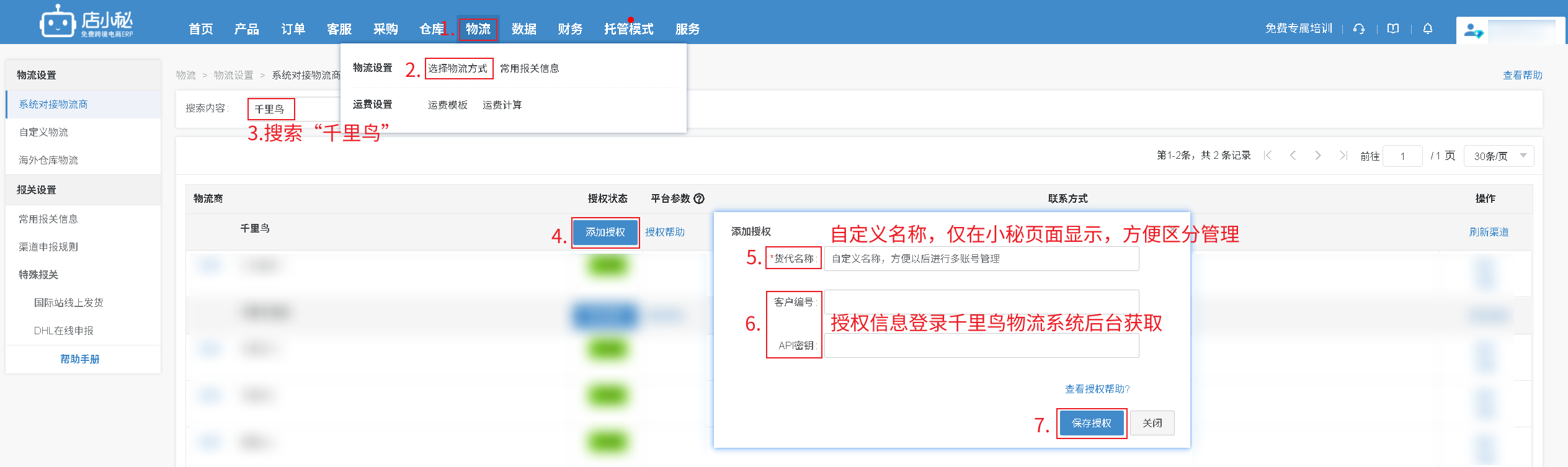 第一步:【物流—选择物流方式—搜索“千里鸟”—添加授权—自定义物流商名称—授权信息登录千里鸟物流系统后台获取—保存授权】