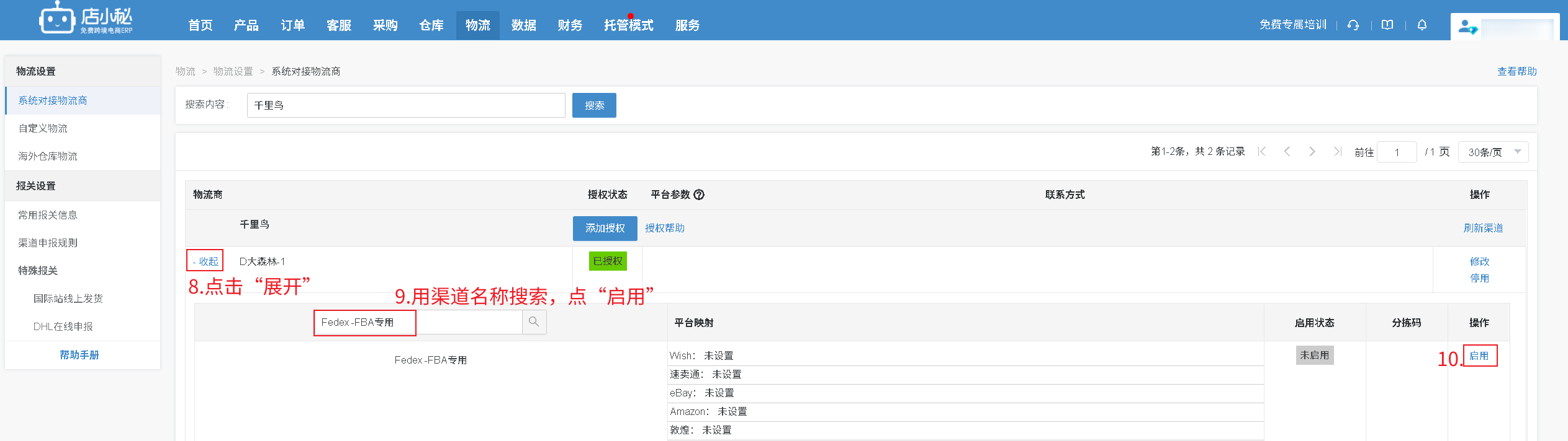 确认清楚后,在店小秘搜索这个渠道的名称,点启用,处理订单就可以选择“已启用”的渠道申请运单号。
