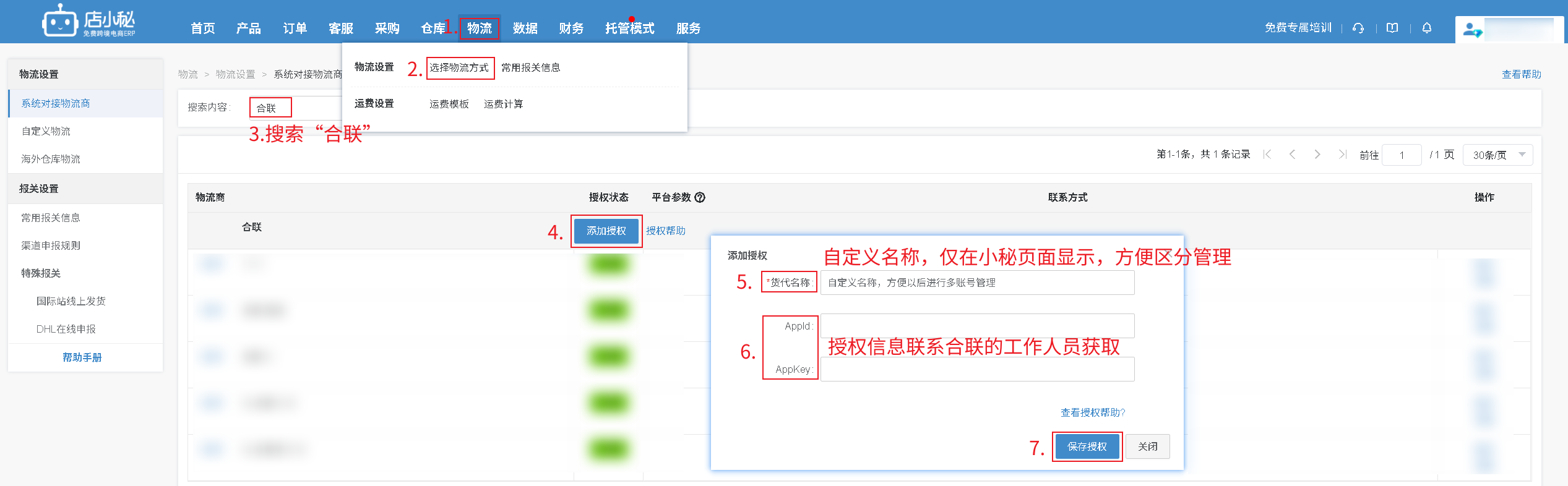 第一步:【物流—选择物流方式—搜索“合联”—添加授权—自定义物流商名称—授权信息联系合联的工作人员获取—保存授权】