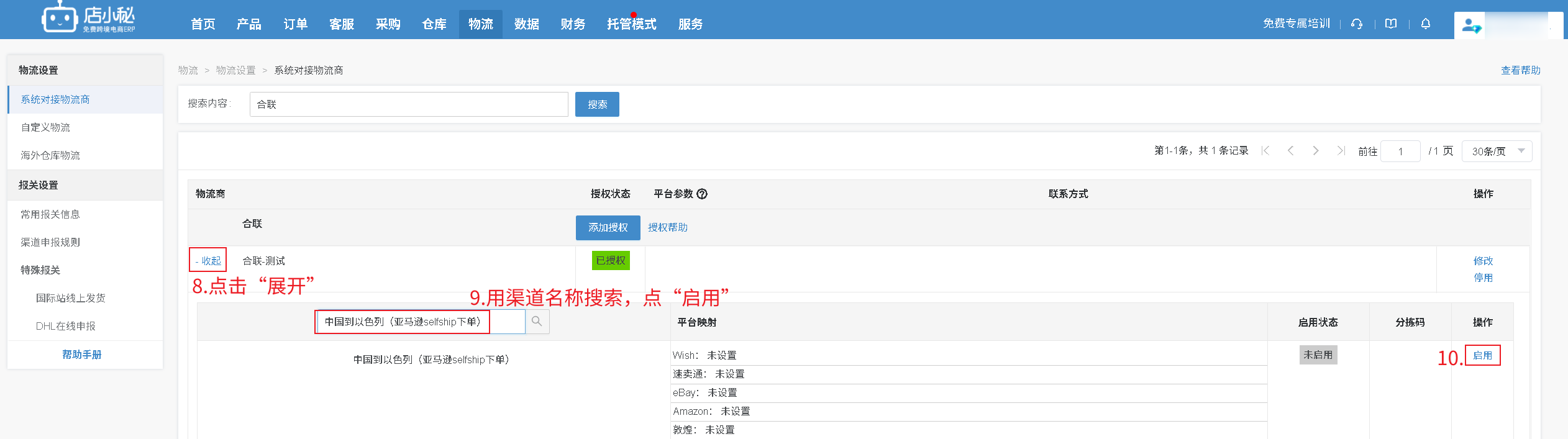 第一步完成授权后,仅代表店小秘和物流的授权打通了,接下来要告诉物流商你的订单走哪个渠道,物流商下面有很多渠道,