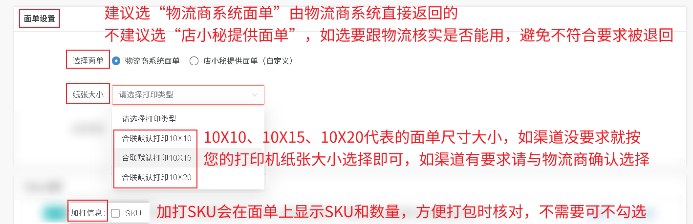 选择面单:请选“物流商系统面单”,由物流商系统直接返回的,不建议选“店小秘提供面单”,如选要跟物流核实是否能用,避免