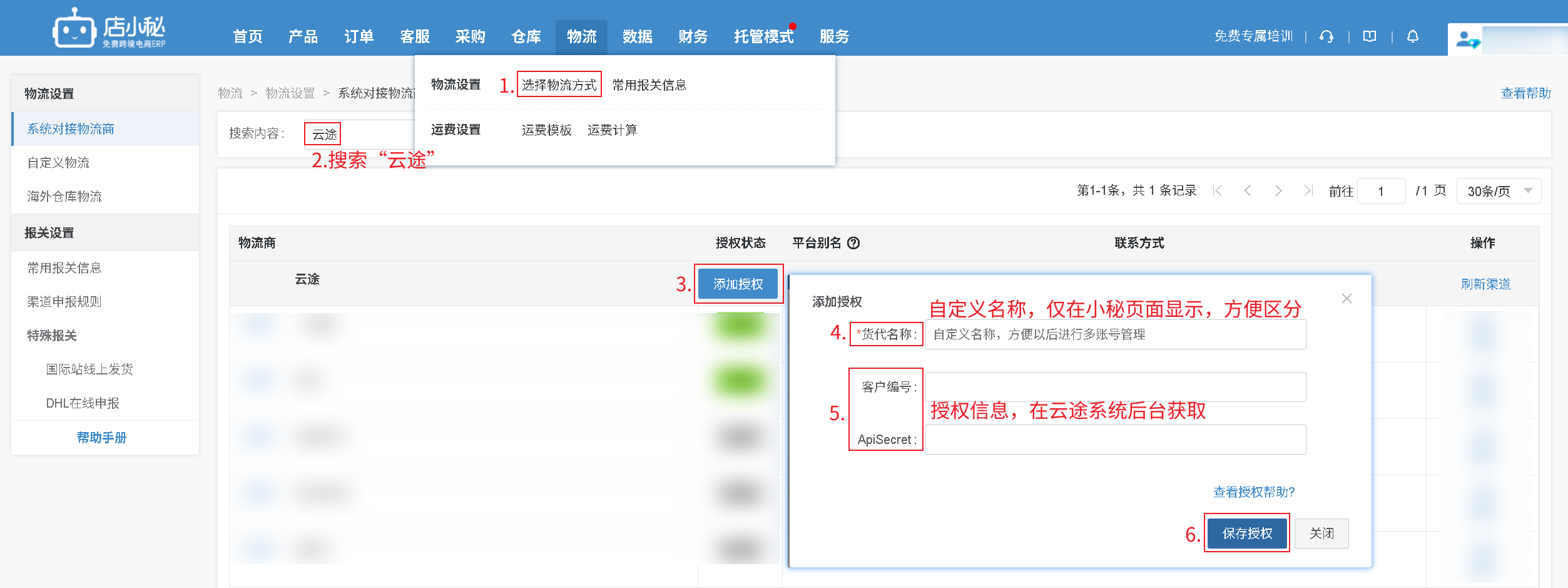 第一步完成授权后,仅代表店小秘和物流的授权打通了,接下来要告诉物流商你的订单走哪个渠道,物流商下面有很多渠道,