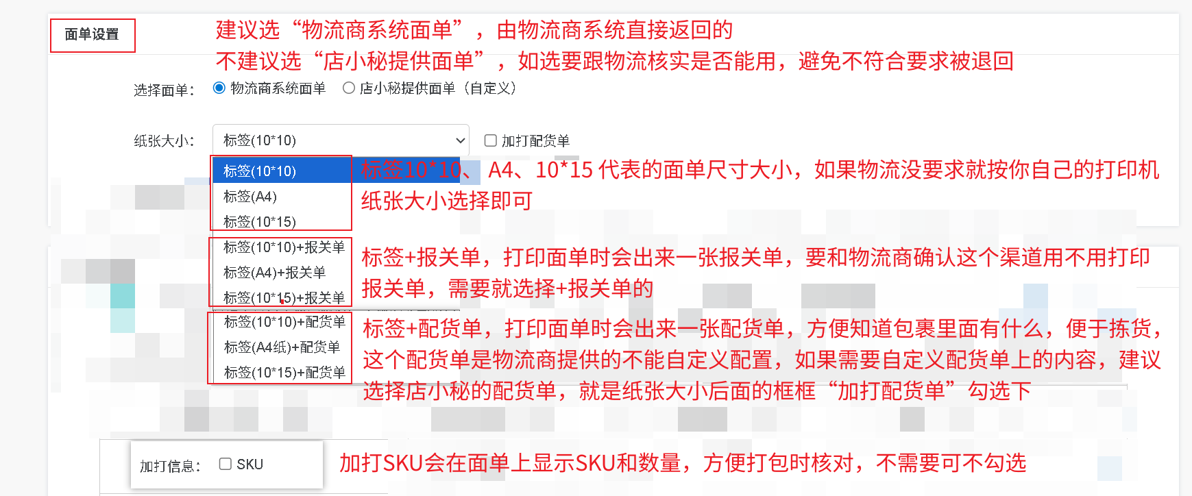 选择面单:请选“物流商系统面单”,由物流商系统直接返回的,不建议选“店小秘提供面单”,如选要跟物流核实是否能用,避免