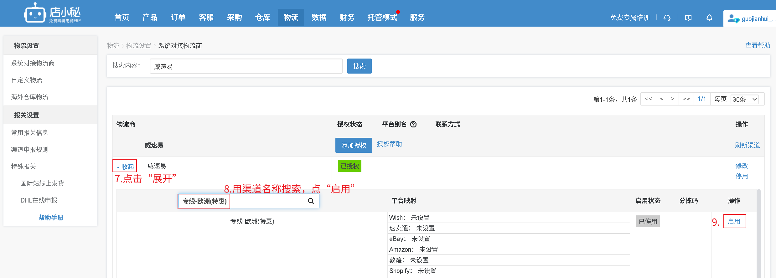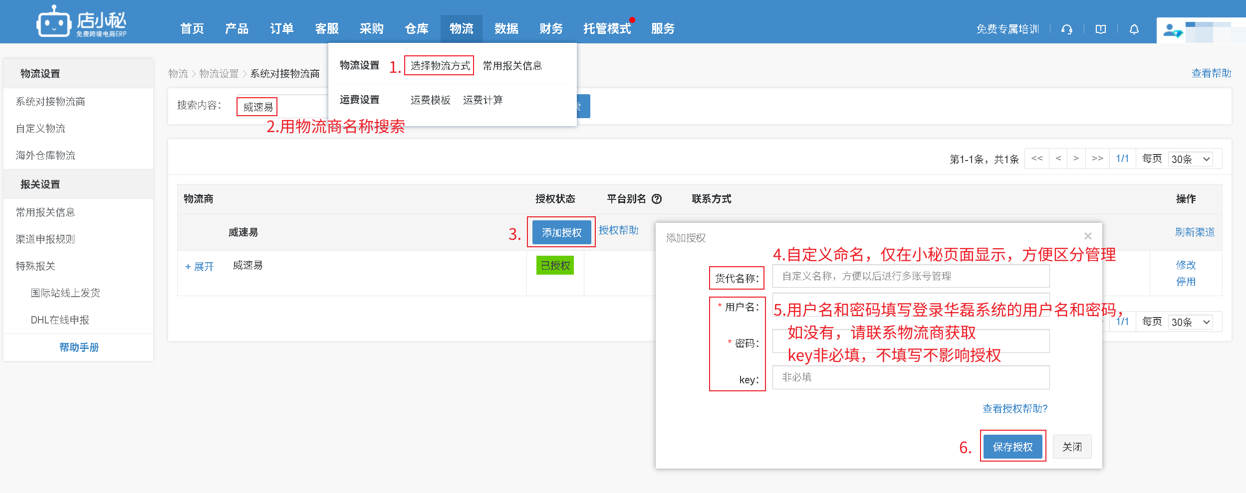 第一步:【物流—选择物流方式—搜索“威速易”—添加授权—自定义物流商名称—授权信息联系物流商获取—保存授权】