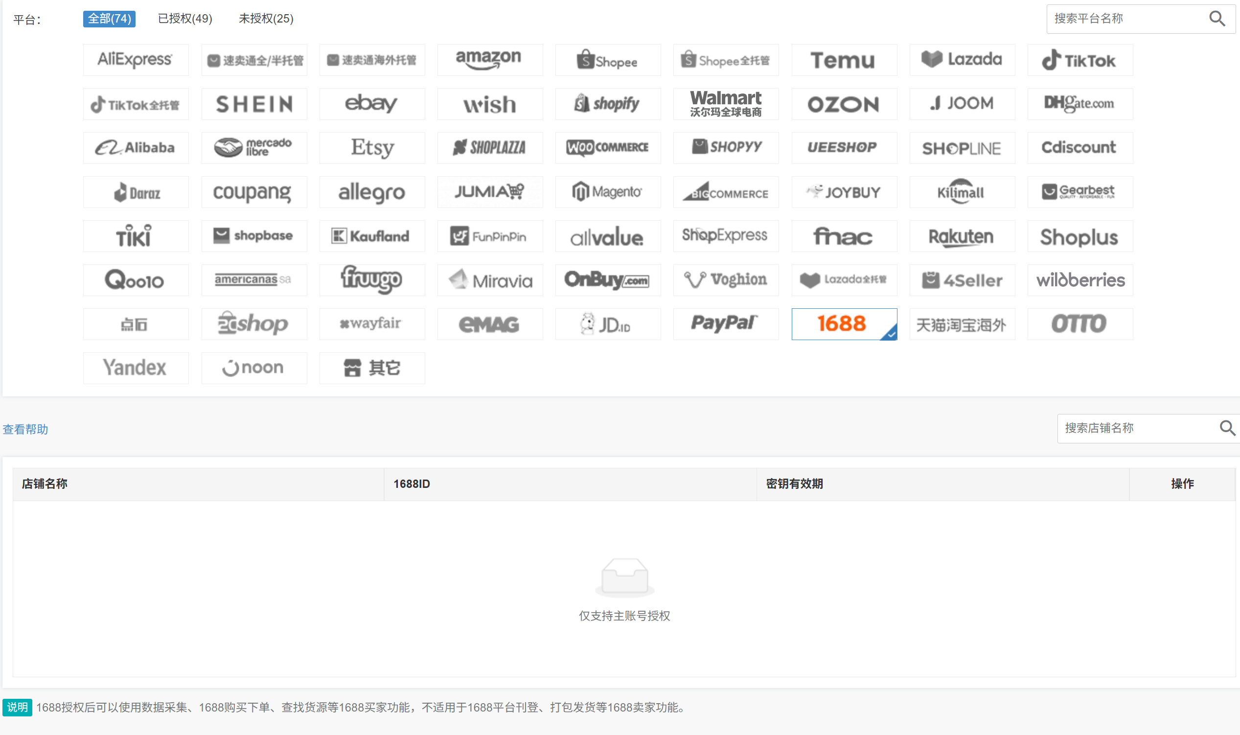 A7:1688店铺只有主账号可以操作授权,且在主账号店铺授权页面才会显示,主账号授权后,子账号可正常操作采集、采购等功能