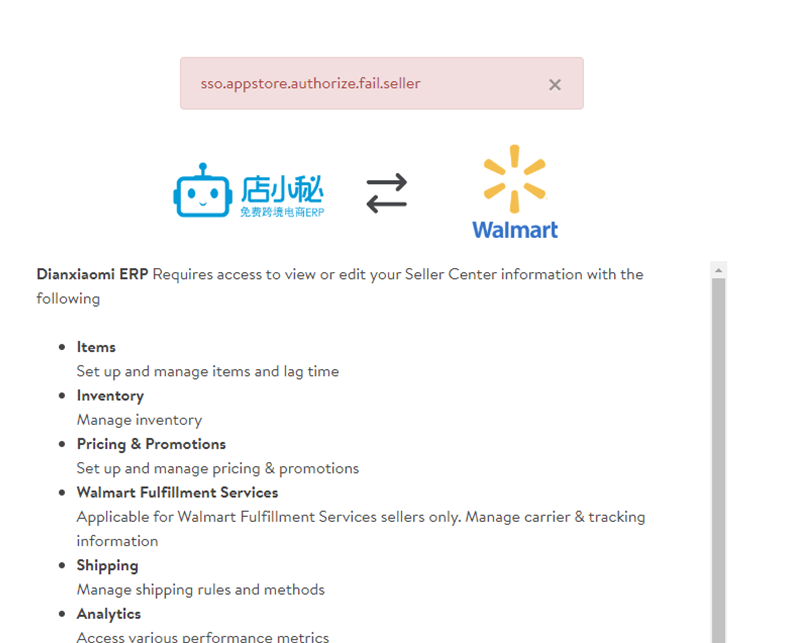 Q5:授权沃尔玛美国提示:sso.appstore.authorize.fail.seller