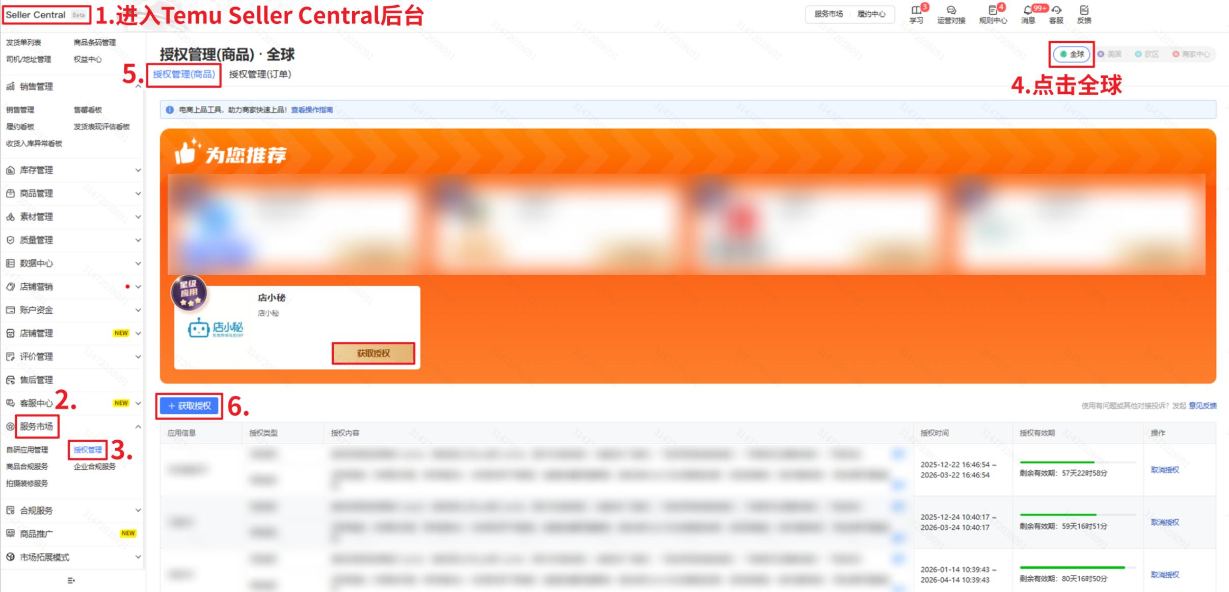 【点此登录Temu后台—服务市场—授权管理—右上角选择全球站点—授权管理(商品)—获取产品库存Token】