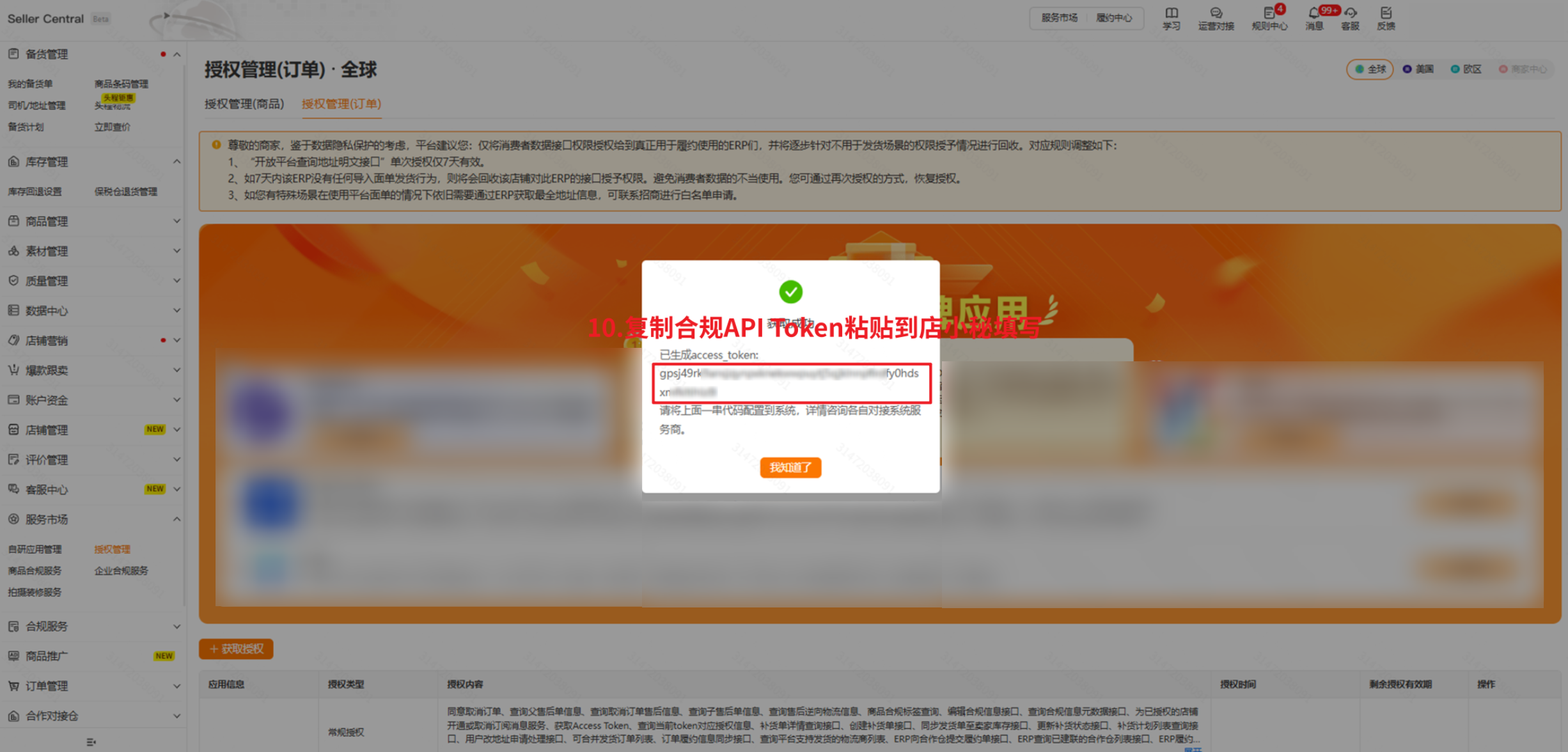 注意:合规API Token必须进入全球站点(订单)获取,不能从其它站点获取,否则授权失败