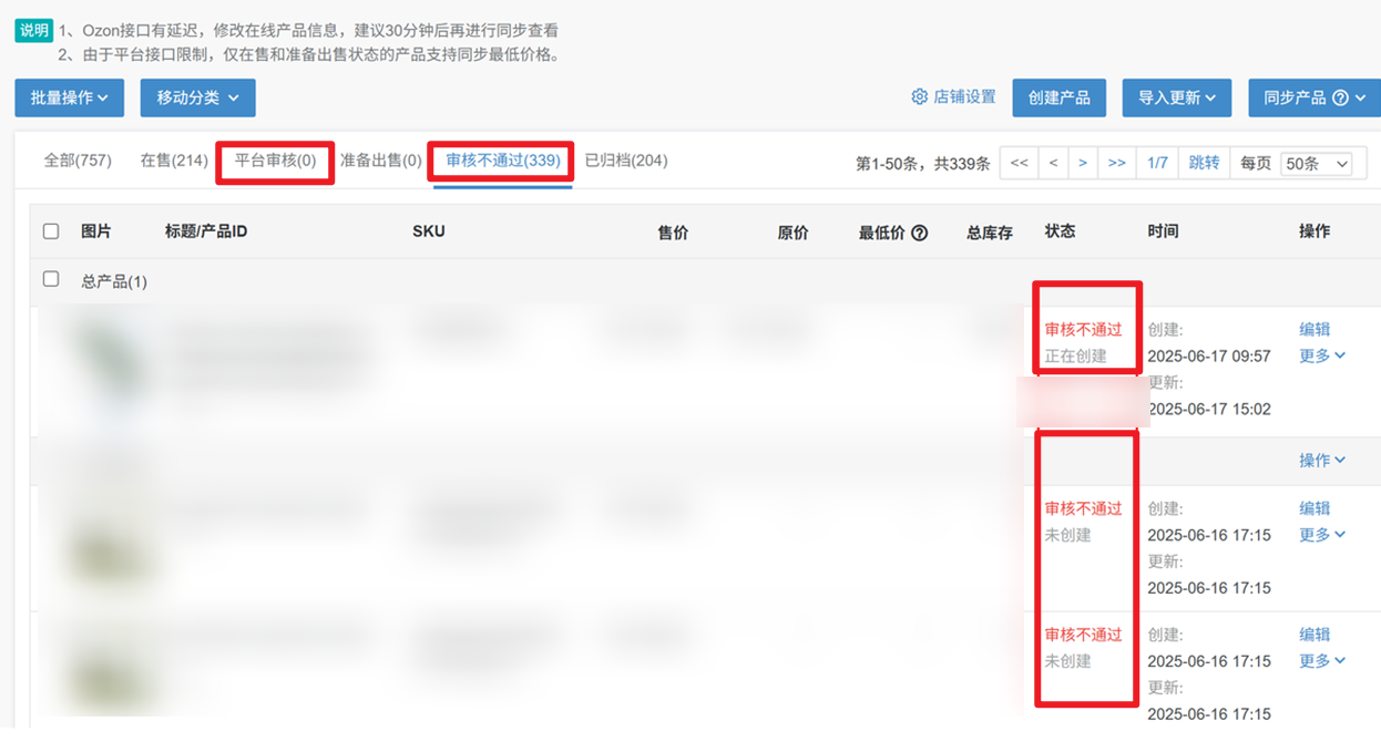 但是Ozon返回的就是审核不通过,所以会进入【审核不通过】状态,这种产品可以先不用管