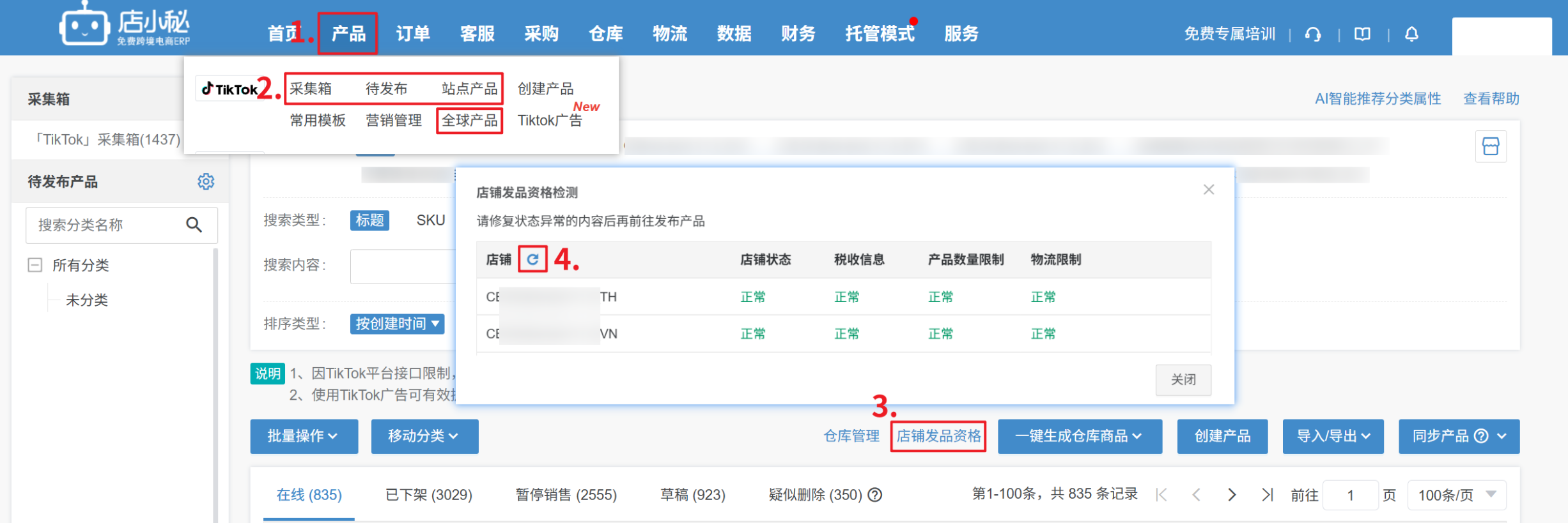 【产品—采集箱/待发布/站点产品/全球产品—店铺发品资格—点击同步查看】